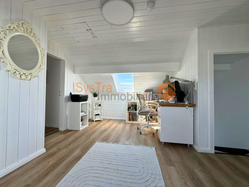 Das Dachgeschoss ist wohnlich ausgebaut und bietet zusätzliche Rückzugsräume, ideal für Homeoffice, Gäste oder Kinder.